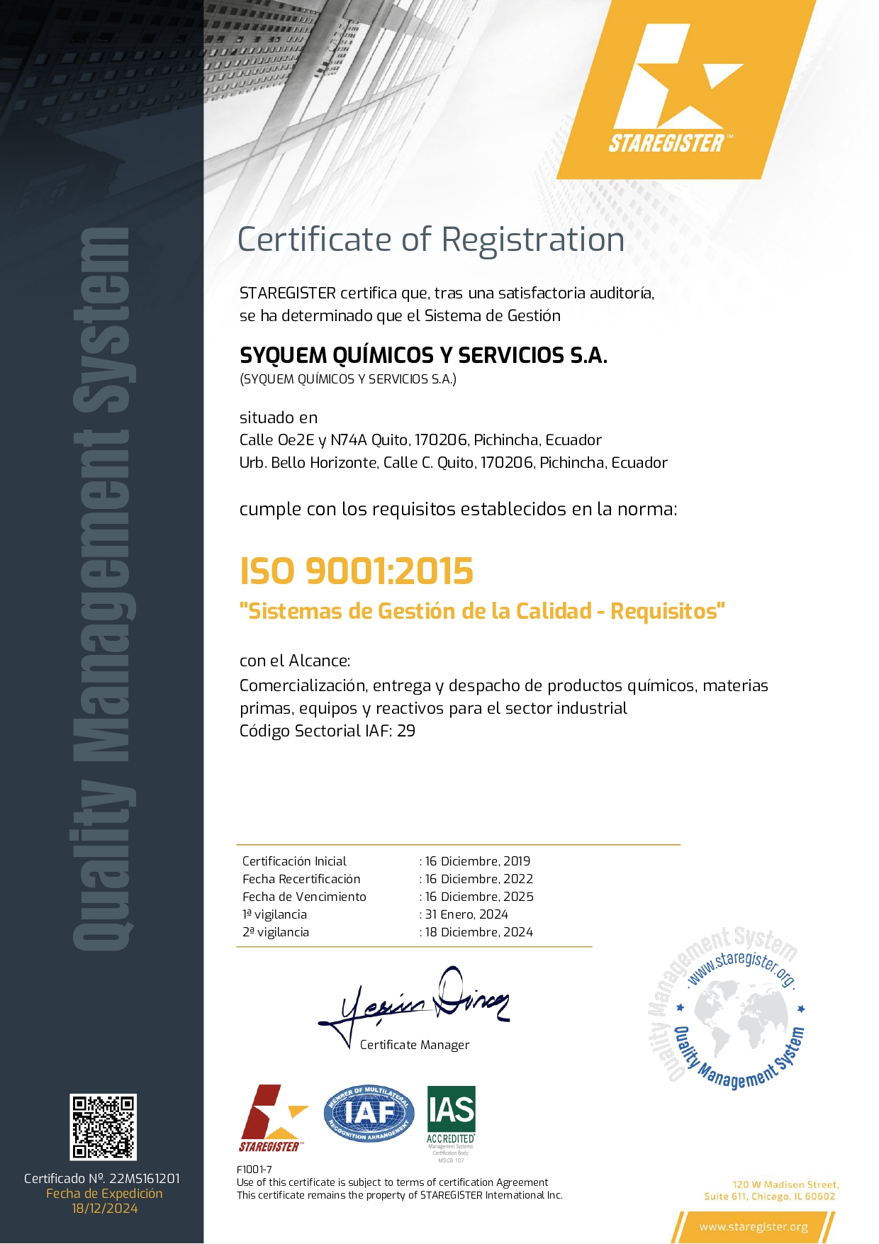 Nuestro sistema de gestión asegura el cumplimiento de los requisitos de nuestros clientes y refuerza nuestro compromiso con la innovación, la seguridad y la sostenibilidad en la comercialización de productos químicos para la industria ecuatoriana.